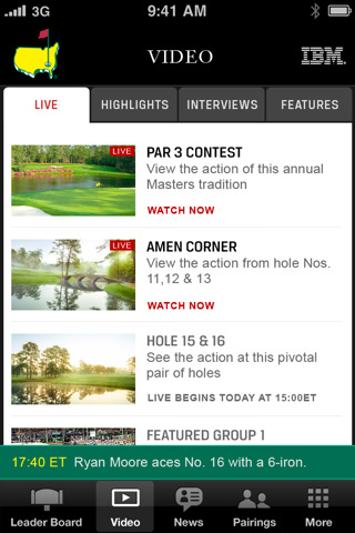 Once the play begins, the coverage on the website is layered with more content than you can imagine. Camera crews remain fixed at Amen Corner, as well as Holes 15 & 16. Two featured groups are followed throughout their entire round. If you can’t catch the entire round, no need to worry – you can “rewind” the day and look back at whatever you missed. Interactive scorecards feature video links to show you how the eagle on 13 was made. Masters.com helps you survive those horrendous hours you are separated from your television during this wonderful week.