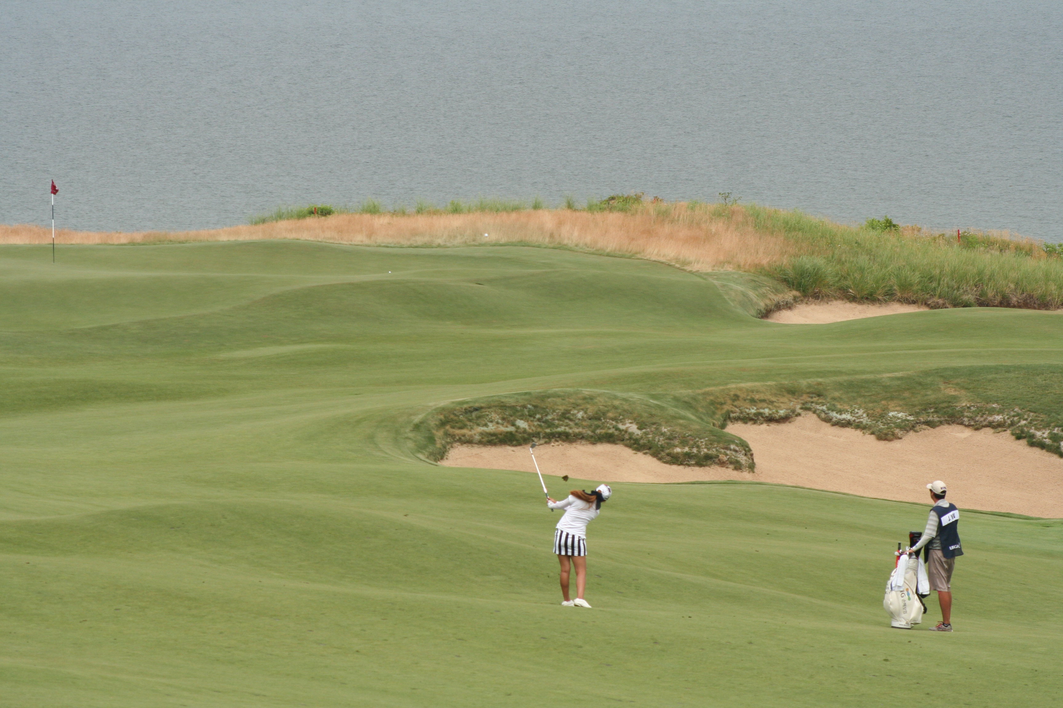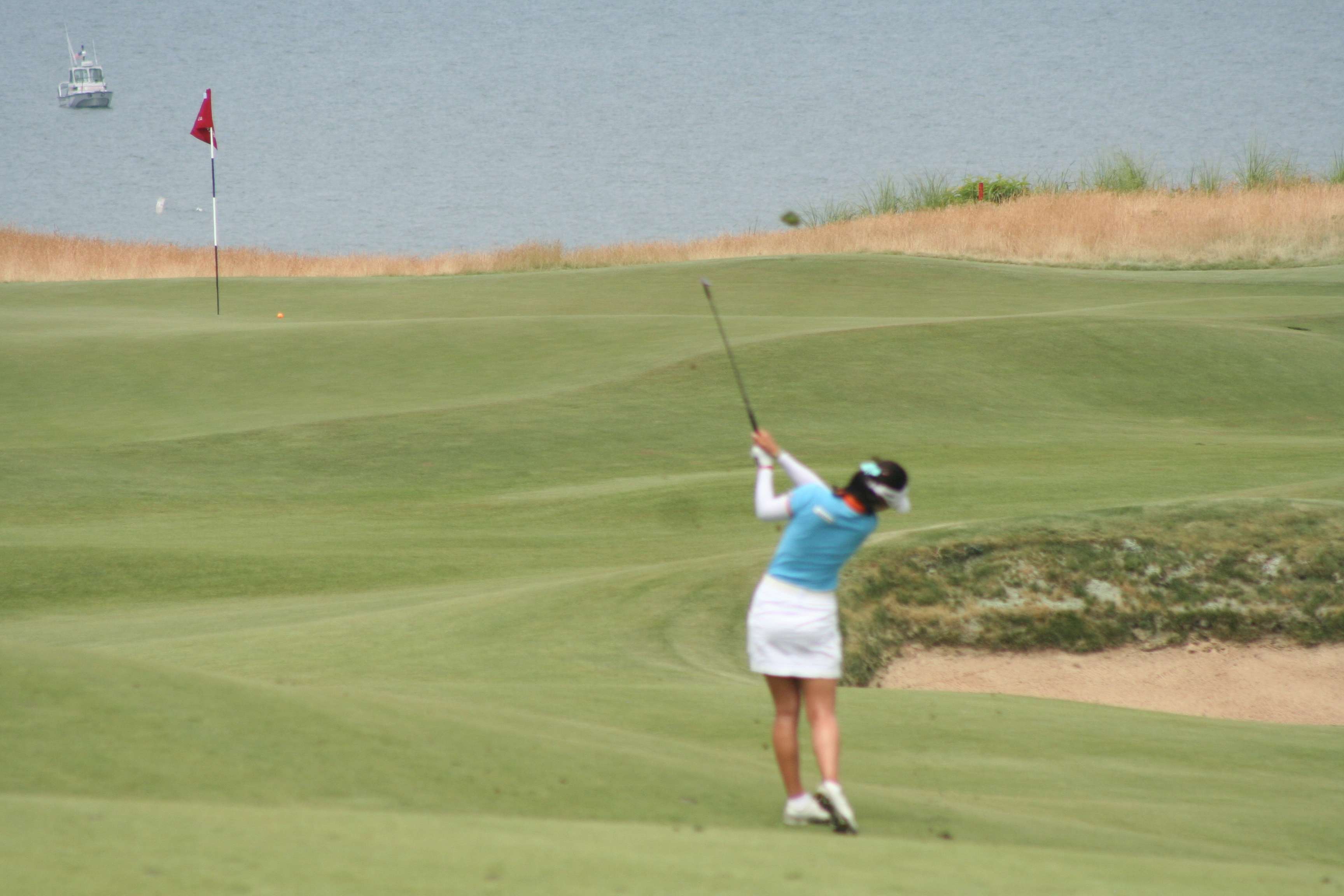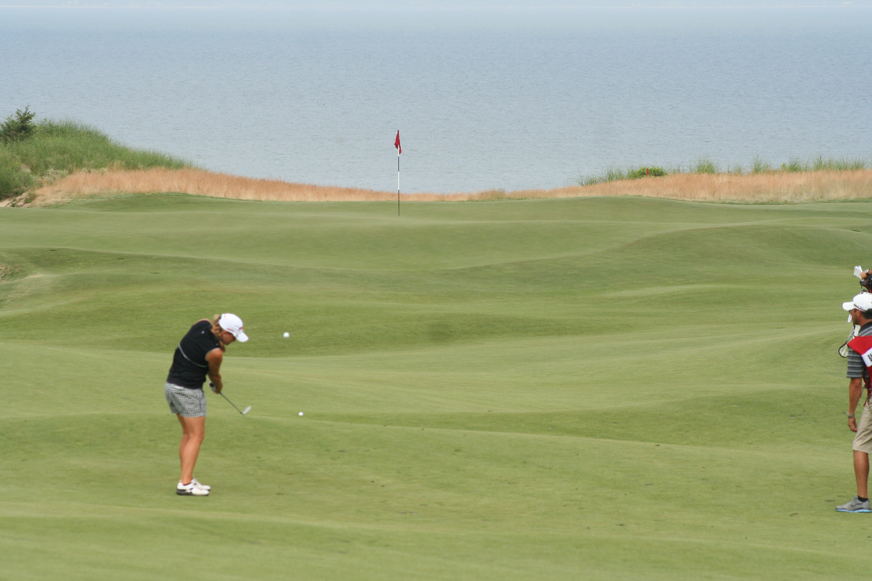 Reason #1: It CAN be driven. Remember the 16th at Oakmont when Cabrera won the Open? Nobody really drove it, even though it was driveable. This hole, reminiscent of a piece of St. Andrews as you near the green, has all the folds and rumples of an ornate dinner napkin, yet once you carry the right-side fairway bunkers (doable from the up tees) it’s a bounce or two and on you are, putting for deuce. If you take a look at the images in the gallery, the ladies were flipping partial wedges at the green today, from the farthest-back deck.